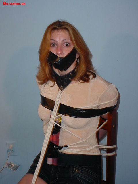 "Now now, you know the rules in this place. No speaking out of turn. In fact, no speaking, period." Sunni moaned as Syn kept applying tape to the lower part of Sunni's face. After she was done, Sunni felt as if her face was locked in an iron grip. She looked up at Syn with frightened eyes. What did she want? Once Sunni was gagged, Syn began to torment the poor lady. First she attached a collar to her neck. Would it be too tight? As Syn pulled the collar on, she would alternately tighten it to the point where Sunni could not breathe, and then she would ease it back. Sunni would try to get a deep breath, but being only able to breathe through her nose made it tough for her. Eventually Syn made it nice and snug, but not too tight. Sunni's breathing settled, and she looked again at her captor, who was approaching with more rope. "In looking at the ropes Moraxian tied you with, and considering what he told me about you," said Syn, "I think I need to add some more rope to ensure you stay put." With that, Syn tied a rope from the front of the collar to Sunni's knees. Sunni looked up in fear at Syn. She still had no idea what Syn wanted. "I have a final surprise for you!" said Syn after she finished roping up Sunni. "Don't go anywhere." She added as she went to fetch the surprise. Sunni struggled to no avail. Syn returned with her hands held behind her back. She first revealed her left hand, which contained another piece of tape. Sunni became curious, but in a moment her curiosity turned to fear as she saw what was in Syn's right hand...a bomb! Syn attached the bomb to Sunni's waist by tucking it under the ropes, and then taping it to the rope. Sunni screamed as loud as she could, but no one could hear. Syn grinned wickedly at Sunni, "This bomb doesn't have a timer, my dear. In fact, it only has a remote control receiver for detonation, meaning, anytime I feel like it, from anywhere in the world, I can blow the bomb up. Your fate, your life, your very existence is now completely in my hands. Scary, isn't it?" Sunni slowly nodded. "I'll leave you alone to think about that, while I think about when would be a good time to push the button." And with those words, Syn departed, leaving Sunni alone... |